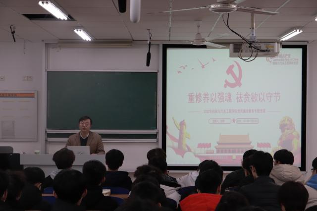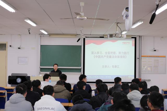 包春江以“深入学习、全面把握、努力践行《中国共产党廉洁自律准则》”为题,带领大家深入学习了《中国共产党廉洁自律准则》的丰富内涵、刚性要求和时代特征。他强调,学习贯彻《准则》,要在研读原文上下功夫,坚持原原本本学、联系实际学,切实把思想和工作摆进去,对照检查、学思践悟,领会精神实质,熟记条文,自觉用《准则》规范言行、指导实践。同时结合工作实际和生动案例,教育引导全体学生党员要加强党性修养,增强廉洁自律意识,告诫党员干部要存戒惧、守底线,时刻做到警钟长鸣。