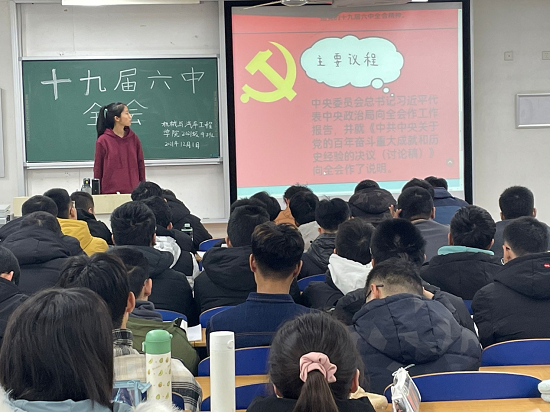 东校区5#c教学楼组织各团支部学习党的十九届六中全会公报及其会议精神,领悟会议思想,加强党史教育。各班级团支部书记担任领学人。