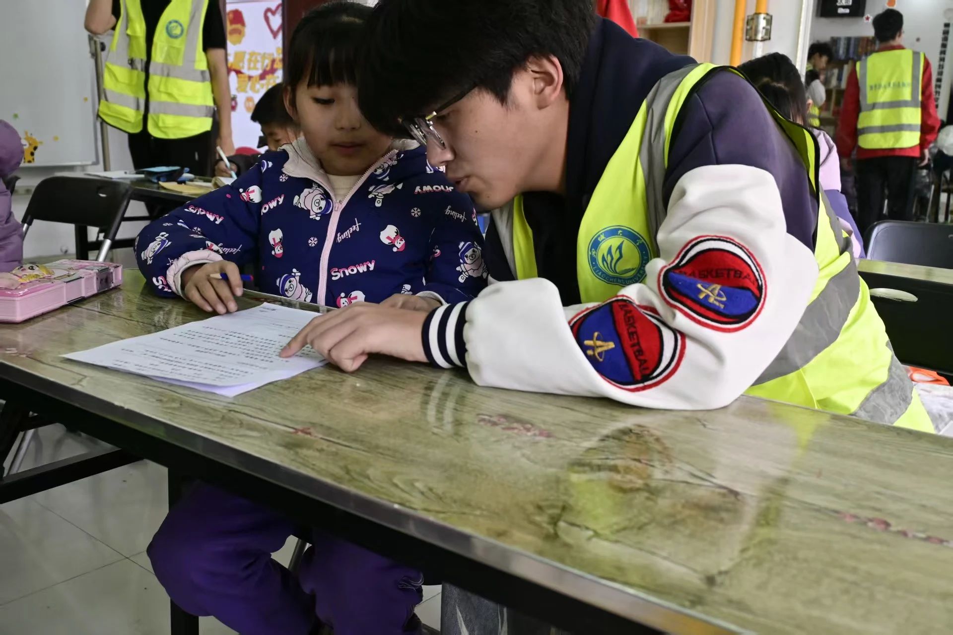 活动开启,首先进入学习辅导环节。在志愿者的耐心引导下,孩子们开始认真自主完成课后作业。志愿者们不停地走在孩子们中间,仔细检查作业完成情况,遇到孩子们提出的难题,便俯下身来,用简单的语言和生动的例子进行讲解。无论是数学运算,还是语文单词,志愿者们都能一一回答,帮助孩子们弄清楚,学明白。