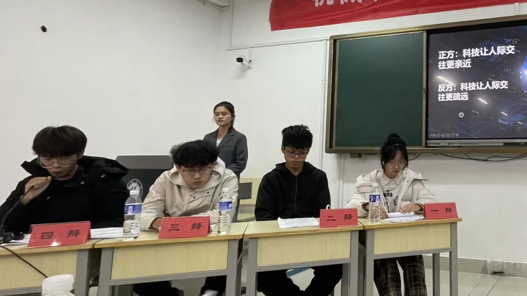 活动开始,双方介绍有礼有节,不卑不亢。开篇立论,正方以“科技让人际交往更亲近”为论题,开展唇枪舌剑,激荡碰撞的立意,反方以“科技让人际交往更疏远”为论题,思维飞扬,雄辩滔滔不绝。驳立论和质辩环节,双方以交替形式轮流发言,于对辩中巧思,于辩言中交锋。