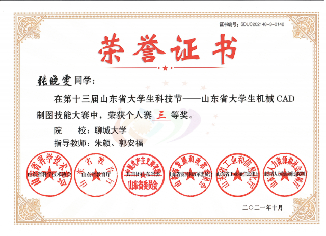 2020级优秀学生张晓雯,在第十三届山东省大学生科技节——山东赛大学生机械CAD制图技能大赛中,荣获个人赛三等奖。