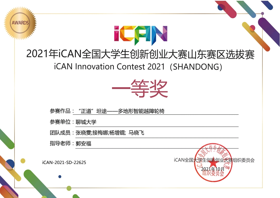2020级优秀学生张晓雯,在2021年iCAN全国大学生创新创业大赛山东赛区选拔赛中,荣获一等奖。
