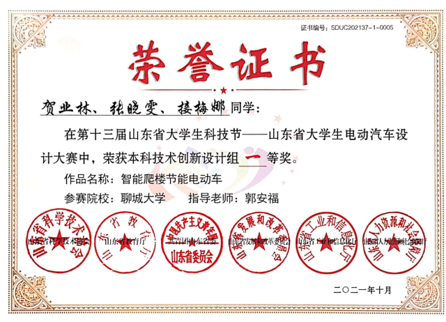 2019级优秀学生贺业林、2020级优秀学生张晓雯,在第十三届山东省大学生科技节——山东省大学生电动车汽车设计大赛中,荣获本科技术创新设计组一等奖。