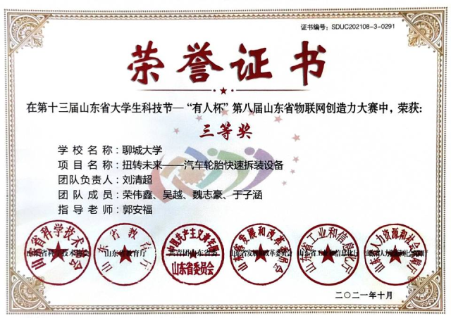 2020级优秀学生吴越,在第十三届山东省大学生科技节——“有人杯”第八届山东省物联网创造力大赛中,荣获三等奖。