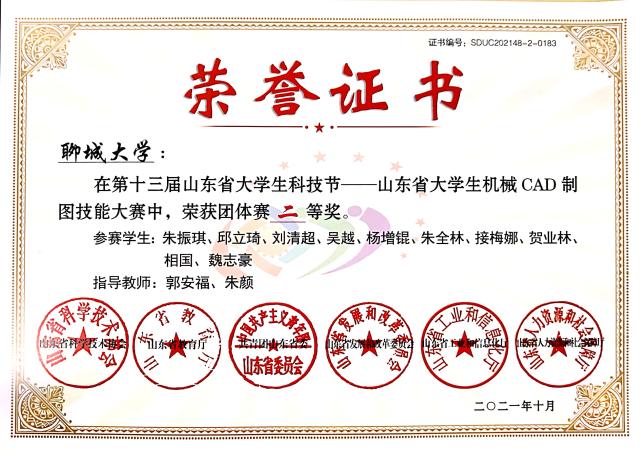 2019级优秀学生刘清超、贺业林,2020级优秀学生吴越、朱全林等,在第十三届山东省大学生科技节——山东省大学生机械CAD制图技能大赛中,荣获团体赛二等奖。