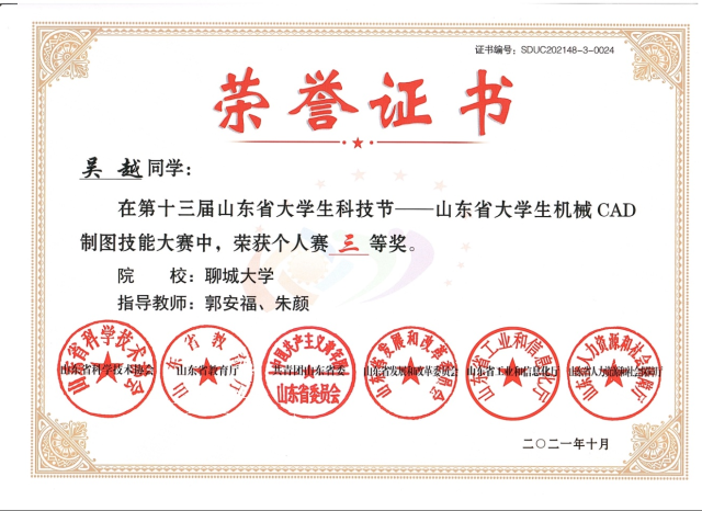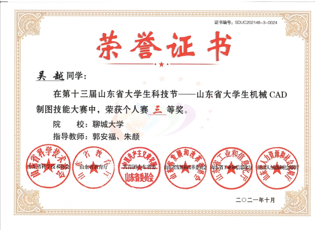 2020级优秀学生吴越,在第十三届山东省大学生科技节——山东省大学生机械CAD制图技能大赛中,荣获个人赛二等奖。
