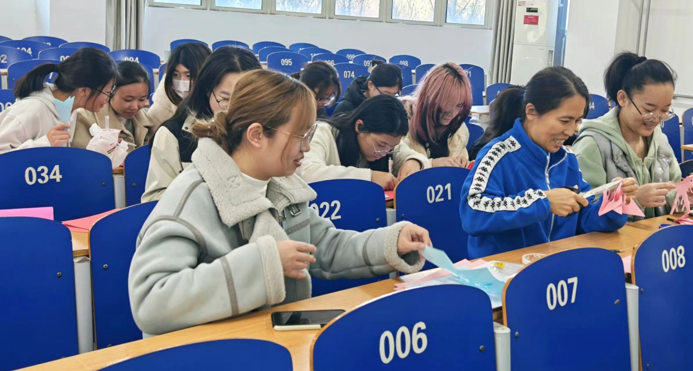 学院组织现场女生开展手工DIY剪纸活动,桌上摆满了鲜艳的彩纸和剪刀等工具,有的学生眉头紧皱,思考着剪纸的图案设计,有的则与旁边的同学交流看法。剪纸作品慢慢增多,有漂亮的雪花,有鲜艳的花朵等,师生们在创作中感受艺术魅力,相互分享自己的创作成果,同时也在传递着心里的那一份喜悦,女生们丰富的想象力、创造力得到了充分展示。同学们渐渐敞开心扉,踊跃发言,就目前感到困扰的人际关系、心理情绪和职业生涯发展规划问题向老师提出了疑问。三位老师认真聆听,现场耐心细致地解答同学们的疑问。活动最后,大家拿着自己的作品合影,师生间的情谊在这一刻被永远定格。