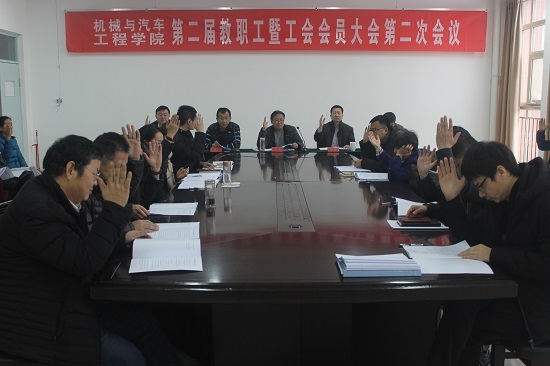 东校区5#c304召开第二届教职工暨工会会员大会第二次会议。参加会议的有汽车学院党总支书记孟庆华,院长包春江,副院长张肃、孙群及学院全体教职工,会议由学院党总支副书记张涛主持。