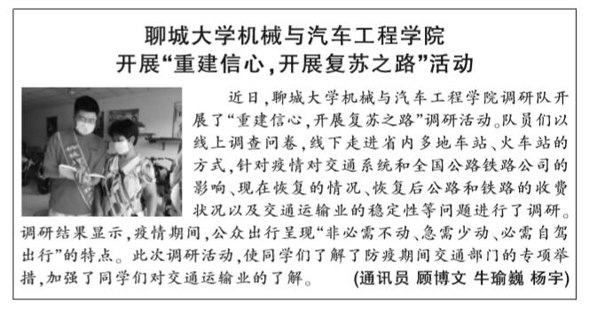 调研队开展关于疫情对交通运输业影响的调研活动。成员们走进山东省多地车站、火车站,与相关工作人员面对面进行交流互动,主要对此次疫情对交通系统和全国公路铁路公司的影响、现在恢复的情况、恢复后公路和铁路的收费状况以及交通运输业的稳定性等问题展开调研。通过对调研结果的整理分析,队员们了解到,疫情期间,公众出行呈现“非必需不动、急需少动、必需自驾出行”的特点。同时,队员们线上以视频方式邀请亲朋好友填写网络问卷,并分享疫情对个人出行及生活的影响。此次调研活动,使同学们了解了疫情期间交通部门的专项举措,加强了同学们对交通运输业的了解。(通讯员 顾博文 牛瑜巍 杨宇)