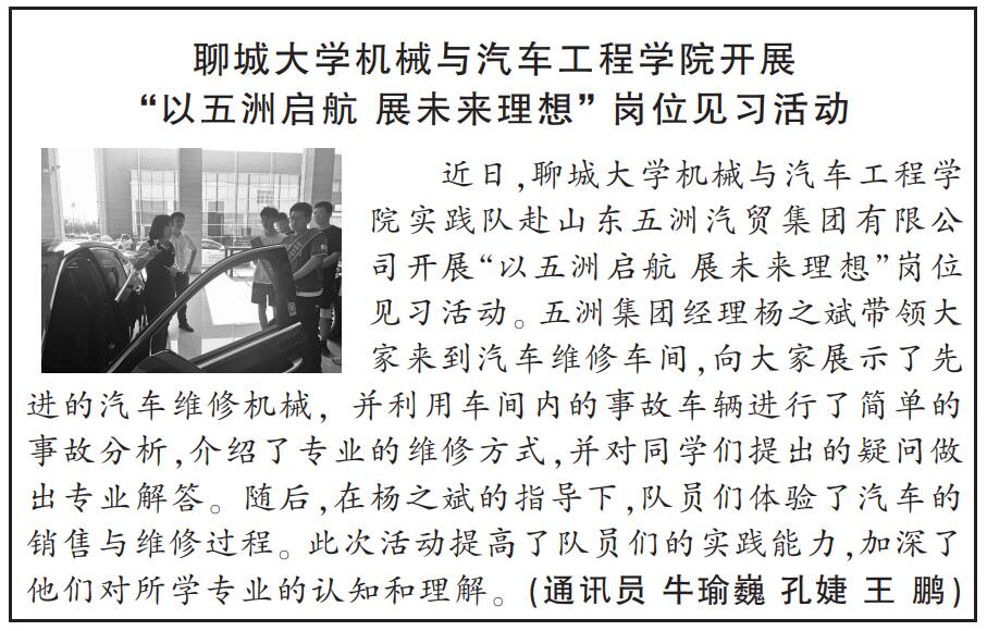 近日,小奶猫直播 实践队赴山东五洲汽贸集团有限公司开展“以五洲启航 展未来理想”岗位见习活动。五洲集团经理杨之斌带领大家来到汽车维修车间,向大家展示了先进的汽车维修机械,并利用车间内的事故车辆进行了简单的事故分析,介绍了专业的维修方式,并对同学们提出的疑问做出专业解答。随后,在杨之斌的指导下,队员们体验了汽车的销售与维修过程。此次活动提高了队员们的实践能力,加深了他们对所学专业的认知和理解。(通讯员 牛瑜巍 孔婕 王鹏)
