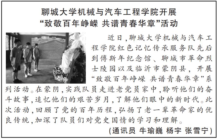 近日,小奶猫直播 红色记忆传承服务队先后到傅斯年纪念馆、聊城市革命烈士陵园以及临沂市蒙阴县,开展“致敬百年峥嵘 共谱青春华章”系列活动。在蒙阴,实践队员走进老党员家中,聆听他们的奋斗故事,追忆他们的艰苦岁月,了解他们眼中的新时代。此次活动,回顾了党的百年历程,弘扬了老一辈革命家的优良传统,加深了队员们对党史国情的学习和理解。(通讯员 牛瑜巍 杨宇 张雪宁)