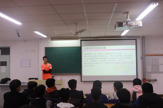 活动伊始,主讲人吕建宇紧紧围绕“什么是朋辈心理辅导”、“朋辈心理辅导的基本功”、“朋辈心理辅导的心理疗法”和“朋辈心理辅导的书籍推荐”四个方面展开讲述,并介绍了学院朋辈心理辅导的活动开展情况、基本工作职能和心理咨询相关制度。在进行案例分析的时候,同学们主动回答问题,就“安慰一位数学成绩没考好的同学”这一经典问题各抒己见,每一次回答都能显示出这次培训给予了这些朋辈辅导员们的进步和成长。吕建宇在讲解“初期共情”内涵时,引起了同学们的巨大反响,同学们认真听讲,仔细记录,从中汲取心理工作的经验,有不懂的问题及时提出,主讲人一一作出解答。最后,吕建宇总结到,“担任朋辈心理辅导员就多了一份责任,要把心理健康问题落实到位,为同学们健康生活打下基础。”