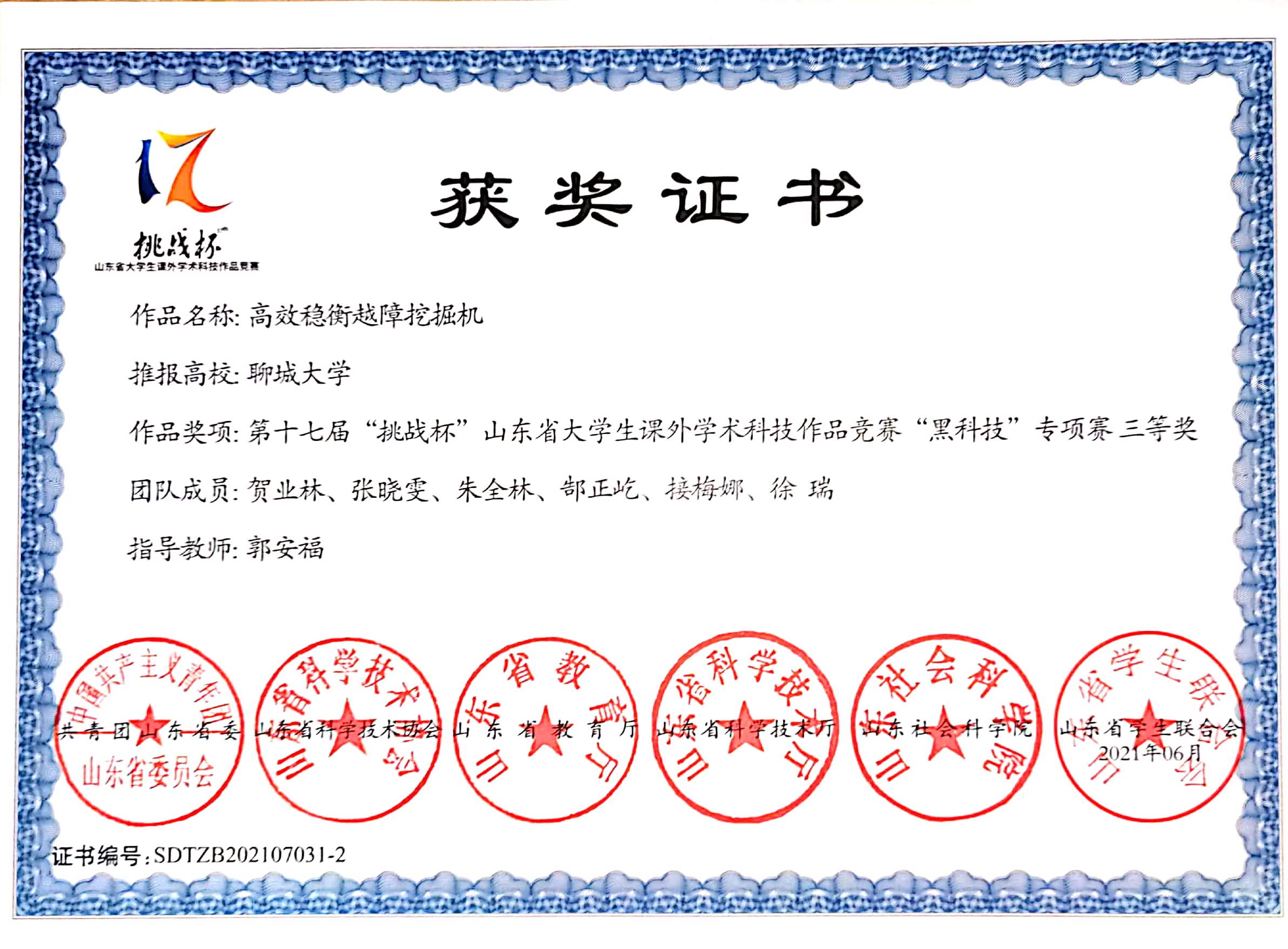 2019级优秀学生贺业林、2020级优秀学生张晓雯、朱全林等,在第十七届“挑战杯”山东省大学生课外学术科技作品竞赛“黑科技”专项赛中,荣获三等奖。