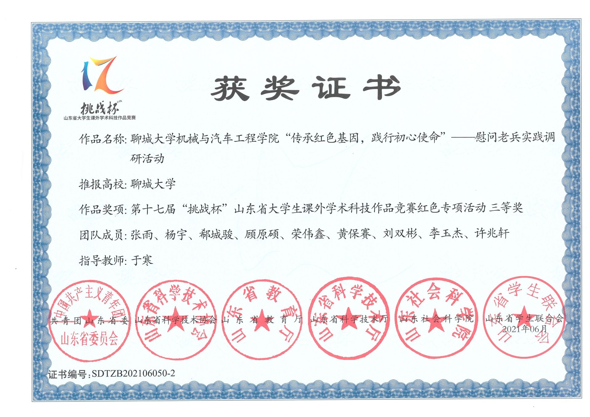 2020级优秀学生张雨、荣伟鑫等,在第十七届“挑战杯”山东省大学生课外学术科技作品竞赛红色专项活动中,荣获三等奖。
