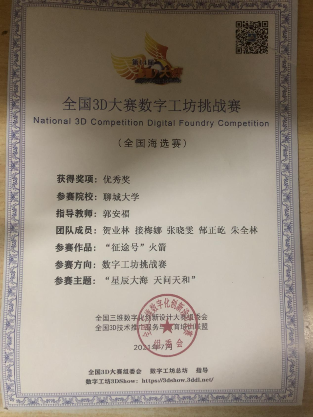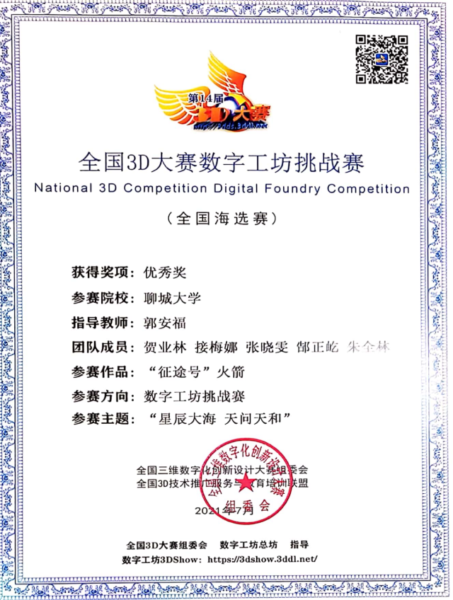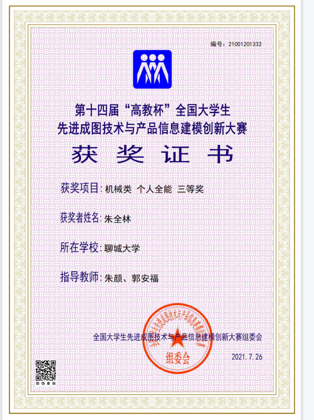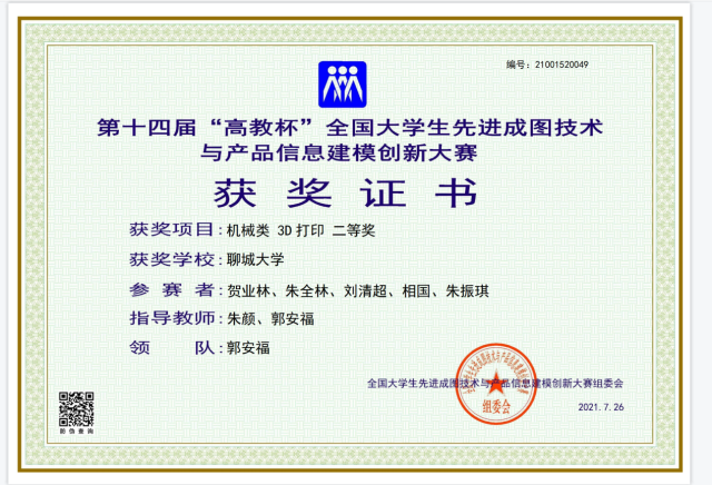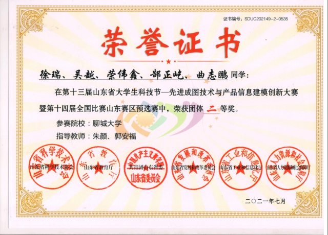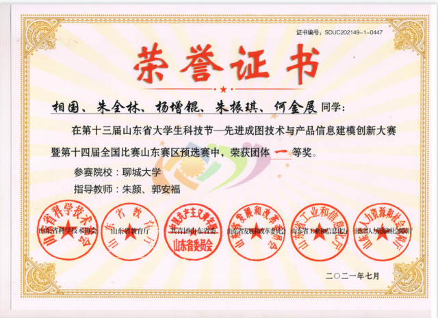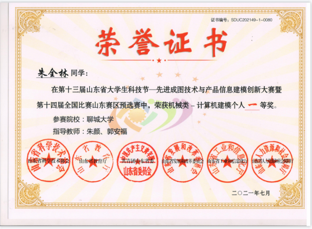 2020级优秀学生朱全林在第十三届山东省大学生科技节_先进成图技术与产品信息建模创新大赛暨第十四届全国比赛山东赛区预选赛中,荣获团体一等奖。