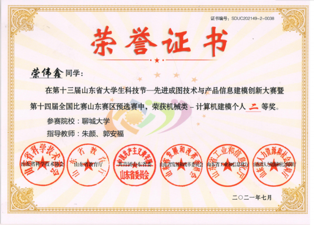 2020级优秀学生荣伟鑫,在第十三届山东省大学生科技节——先进成图技术与产品信息建模创新大赛暨第十四届全国比赛山东赛区预选赛中,荣获团体二等奖。