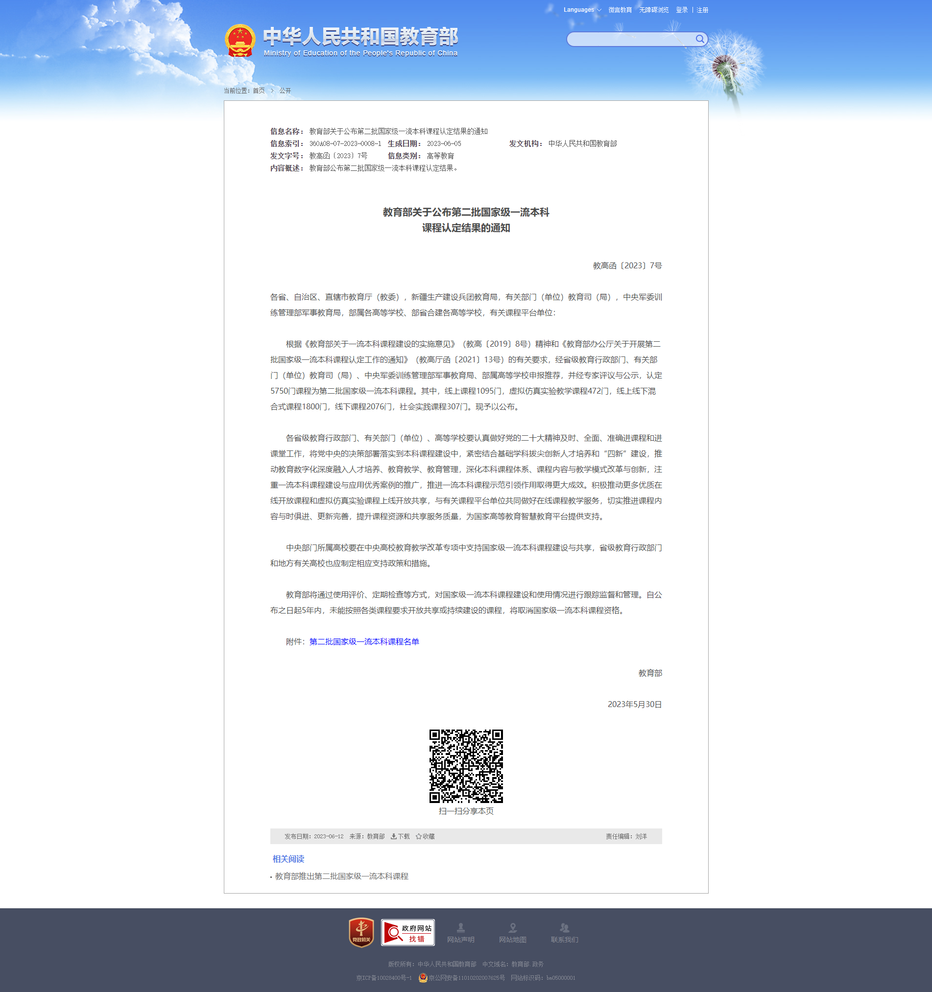 教育部近日发布了《关于公布第二批国家级一流本科课程认定结果的通知》(教高函〔2023〕7号),小奶猫直播